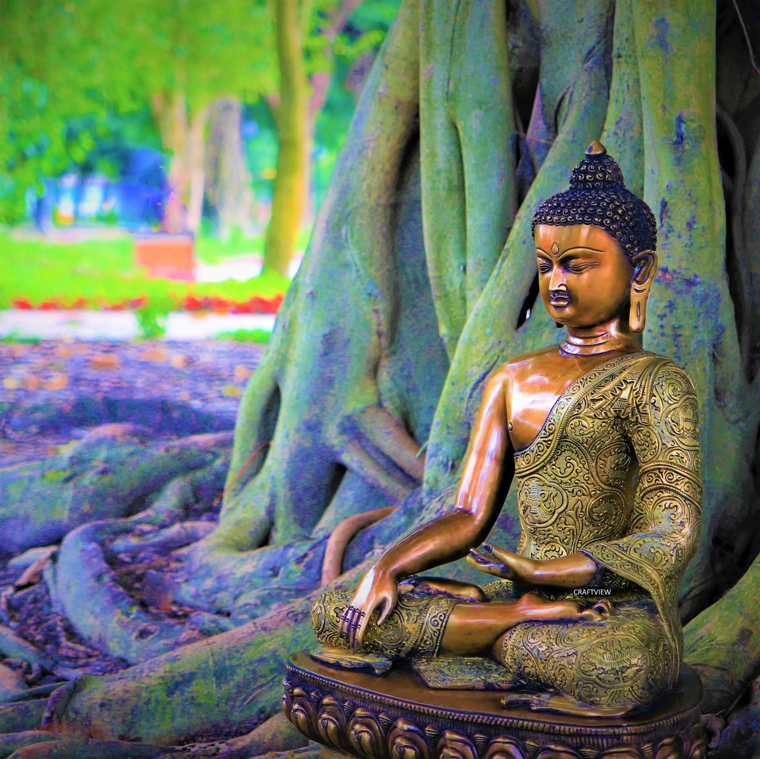 Brass Blessing Buddha With Bodhi Tree Background 30"