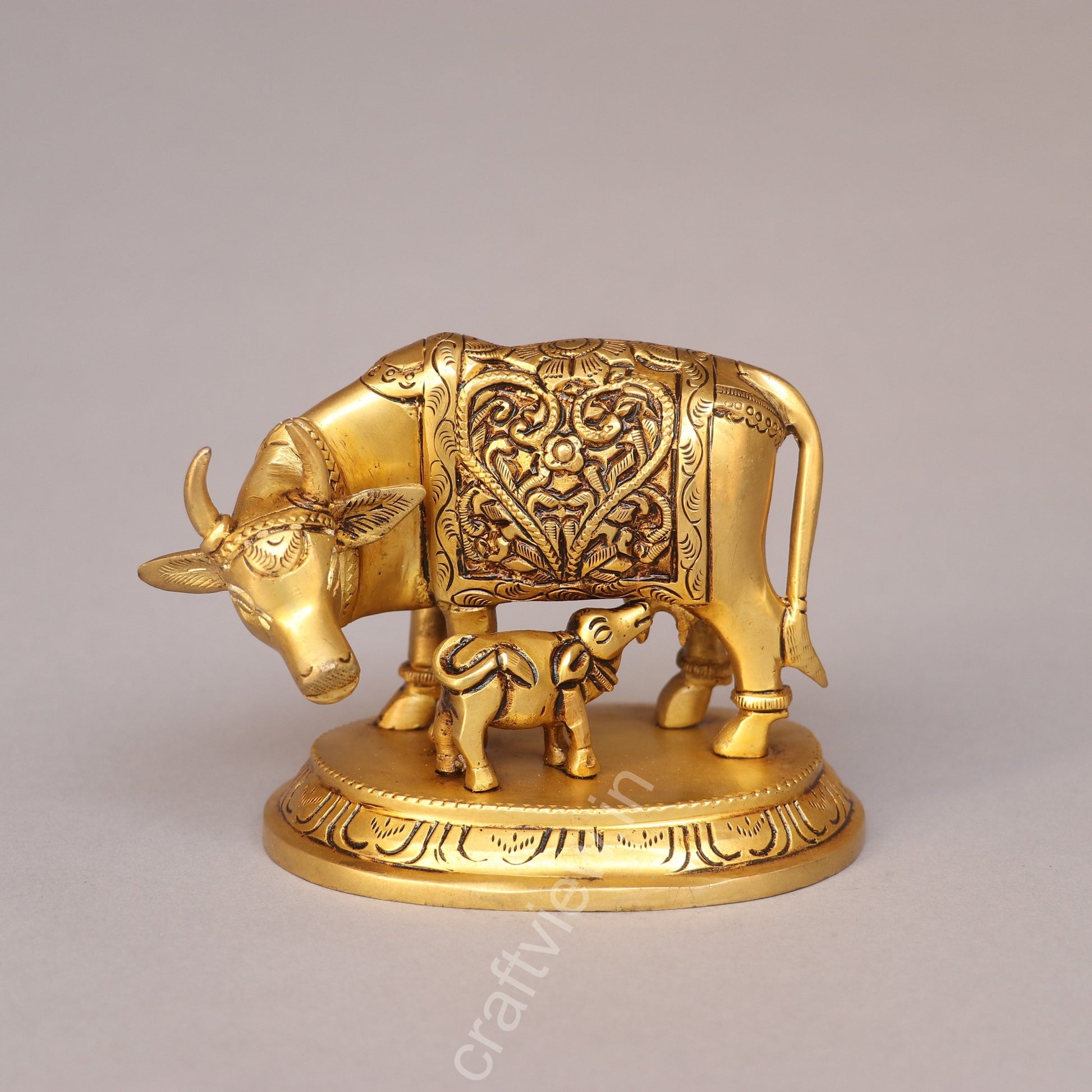 Brass Cow & Calf Animal Statue This divine cow, lives in Heaven, emerged from the Ocean of Milk at the time of Samudra Manthan.