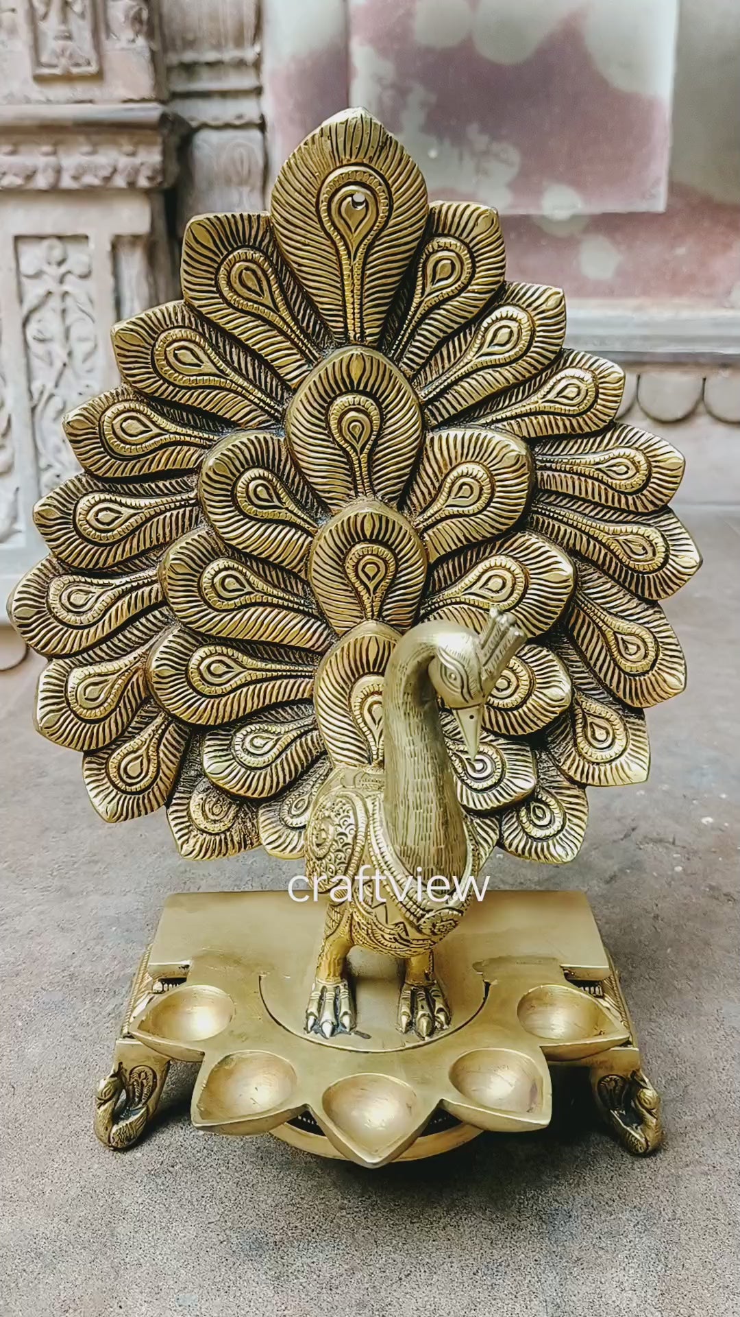 Typically, these lamps feature detailed craftsmanship, with the body of the lamp shaped like a peacock, often adorned with engravings and embellishments. They are usually filled with oil and fitted with a wick for lighting. When lit, they create a warm, inviting glow and are often used during festivals, ceremonies, or daily worship.