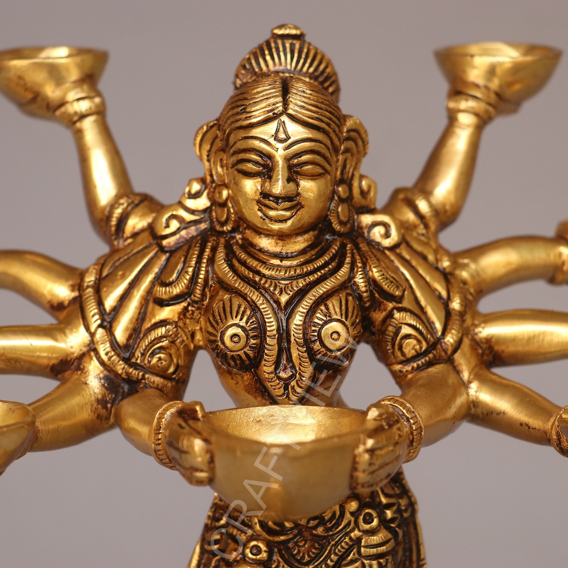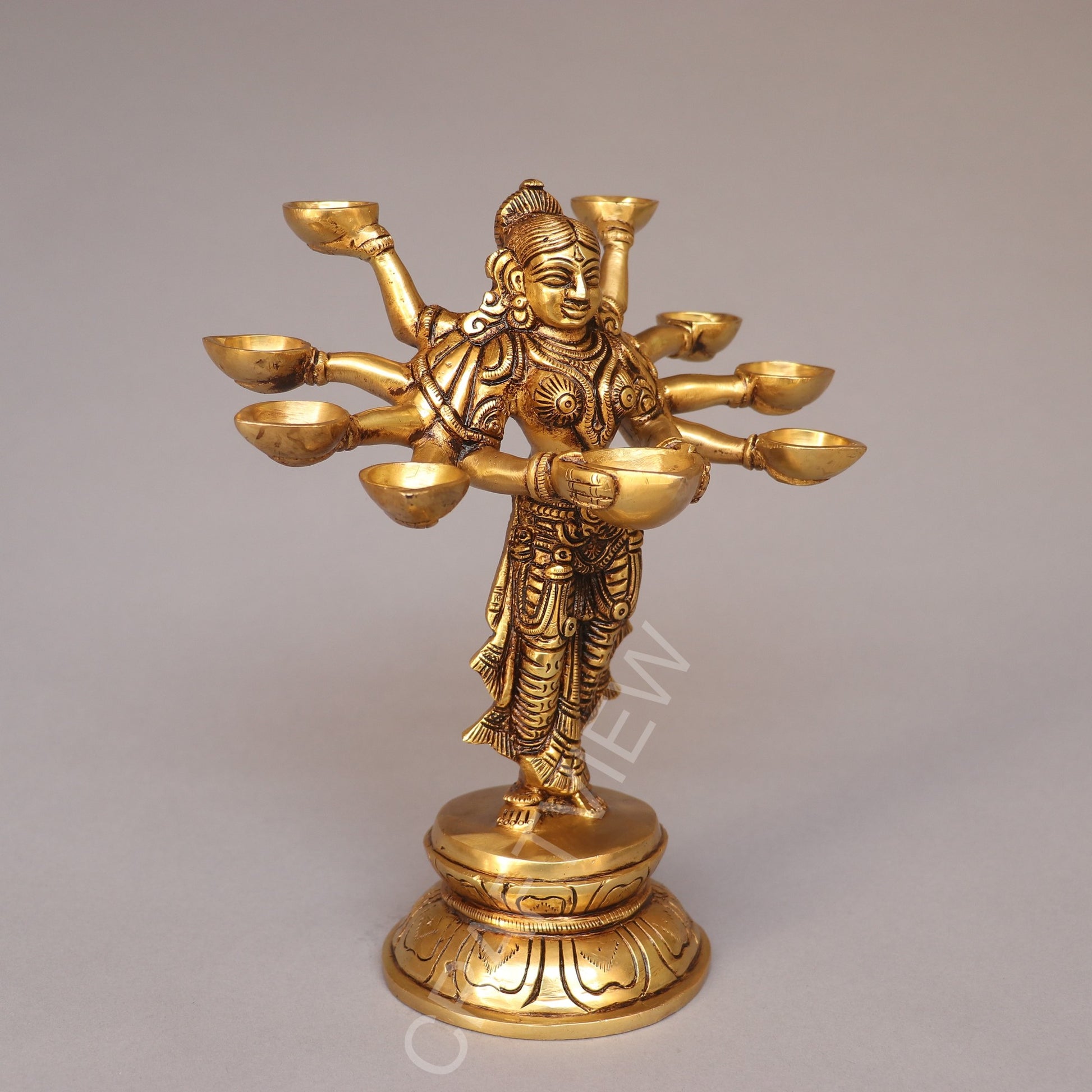 Bring home the eternal radiance of tradition with this exquisitely handcrafted Brass Deeplakshmi Deepam. Depicting Goddess Lakshmi holding multiple diyas, this masterpiece represents abundance, purity, and the triumph of light over darkness. Each lamp she carries symbolizes blessings flowing in all directions—wealth, harmony, and spiritual illumination.