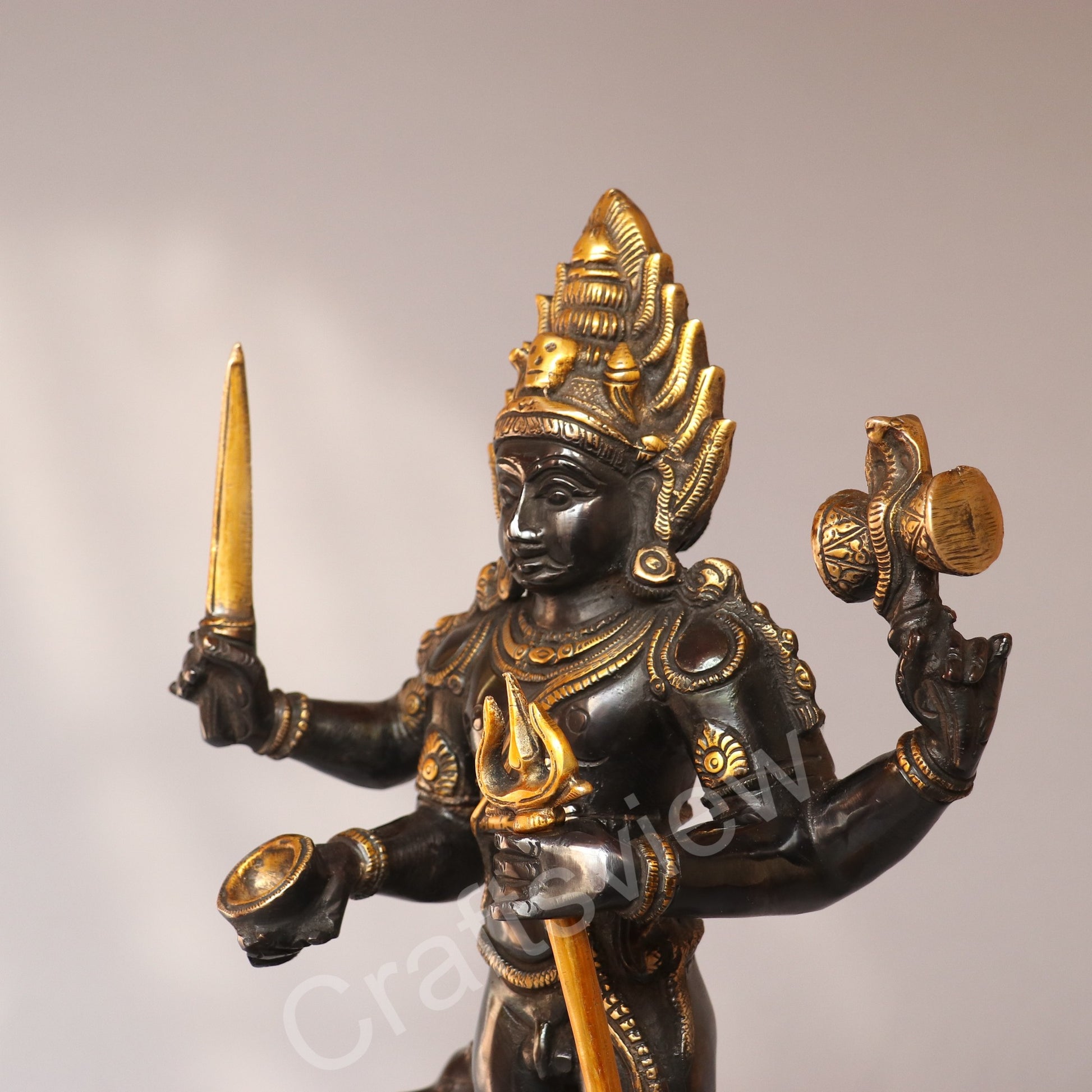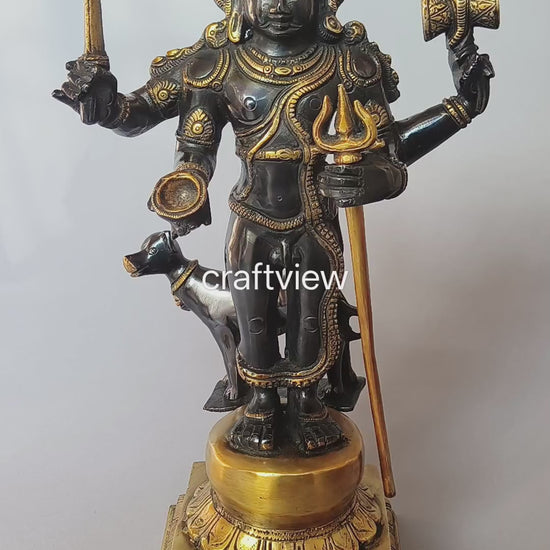 In this particular brass idol, Kaal Bhairava is depicted riding a dog, symbolizing his connection to the underworld and the darker aspects of existence.