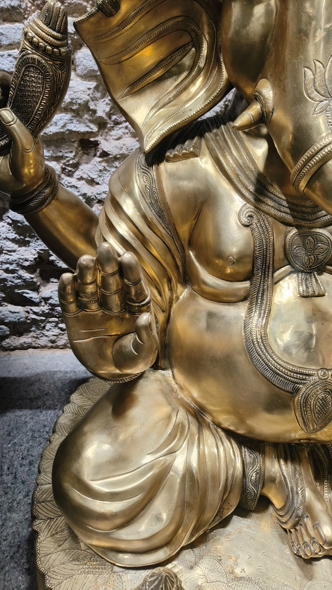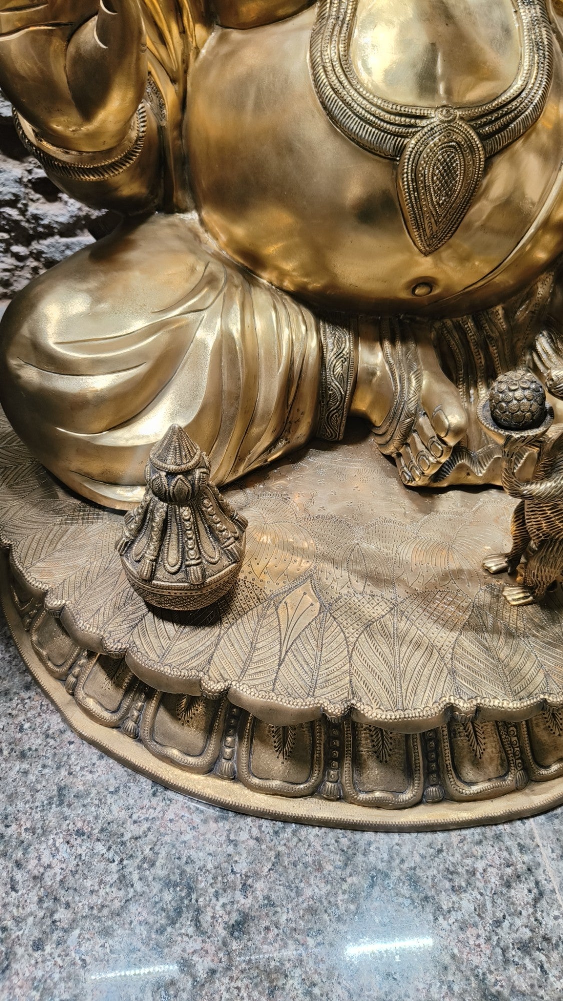 A brass Largest Ganesha statue seated on a Carving Lotus base is a beautiful and meaningful representation of Lord Ganesha, the remover of obstacles, the deity of wisdom, and the patron of new beginnings. The lotus base is a significant symbol in Hinduism, representing purity, spiritual growth, and the blossoming of wisdom. By placing Lord Ganesha on a lotus, the statue emphasizes his connection to the divine and his ability to bring clarity, purity, and wisdom into one's life