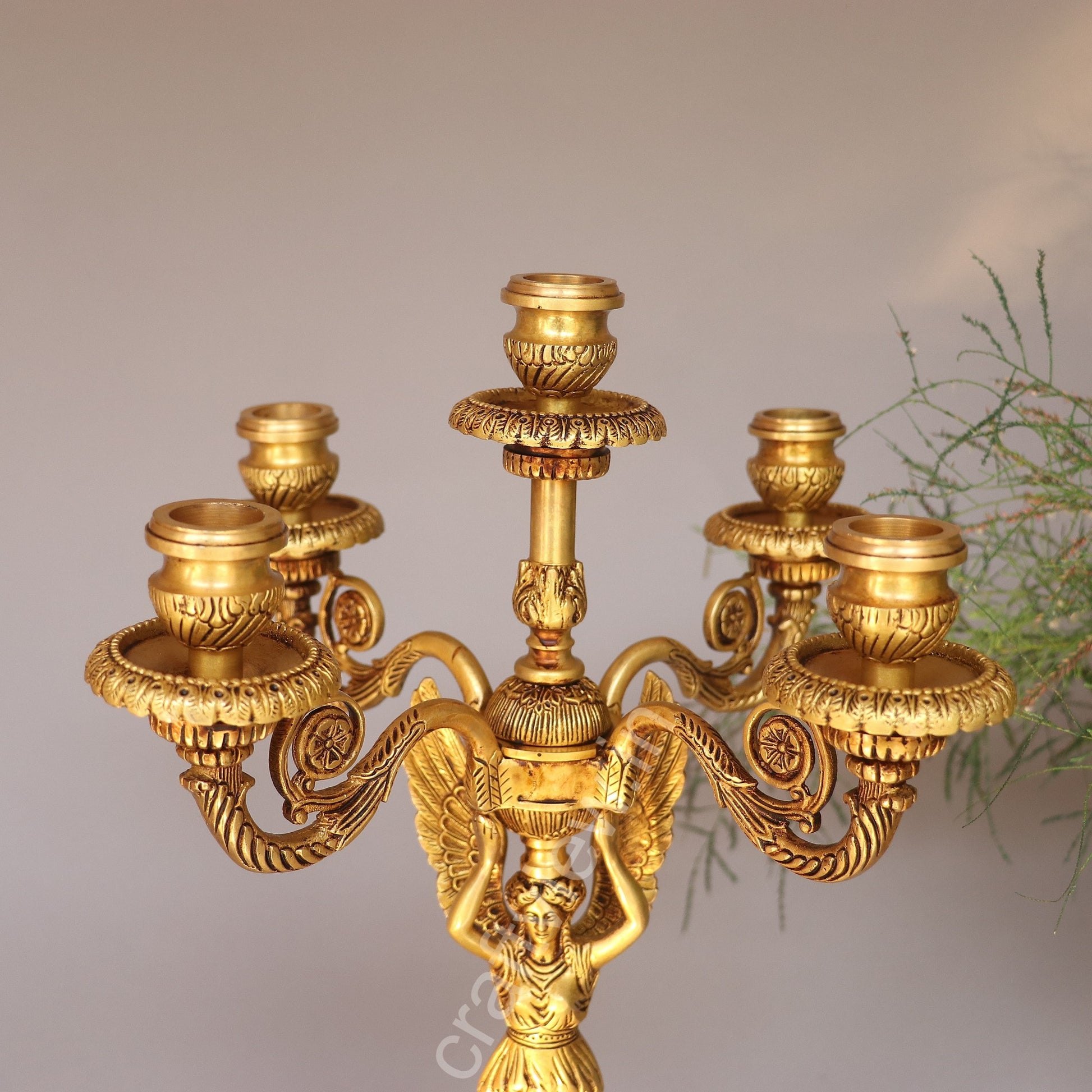 The design, featuring a divine figurine holding the structure, highlights themes of strength and grace. With multiple holders, it is perfect for placing candles that illuminate your living space with a warm, enchanting glow.