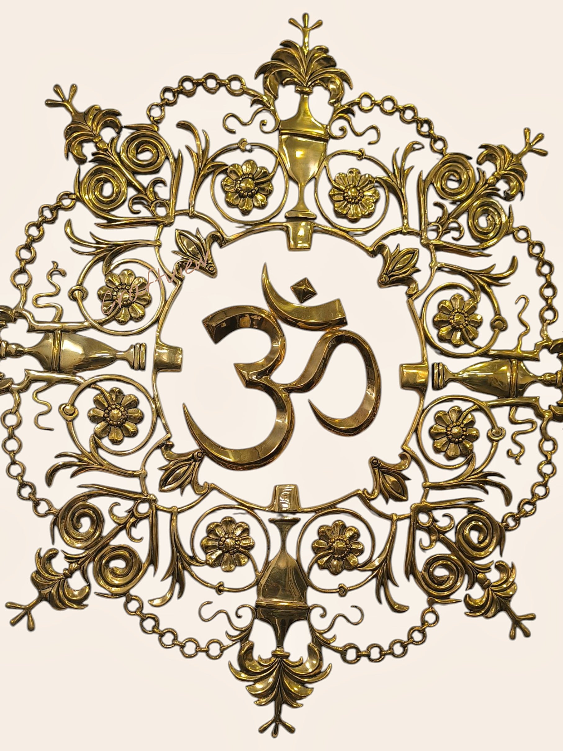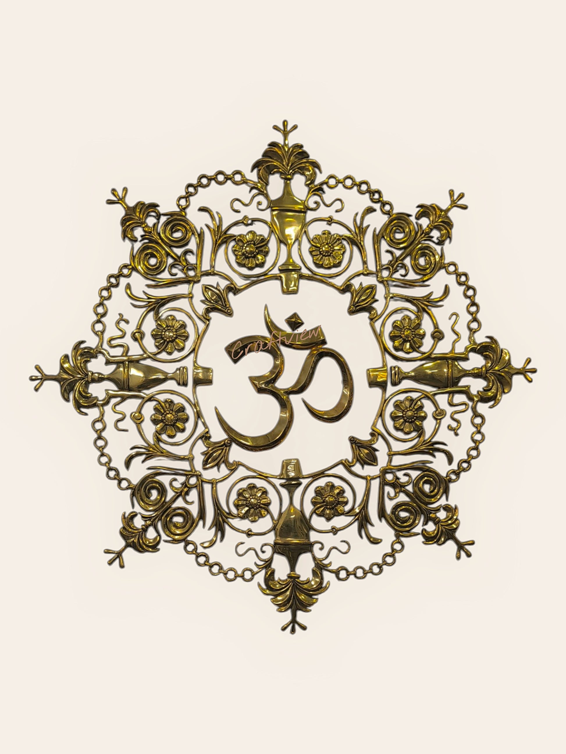 The sacred symbol “Om”, placed at the center, resonates with universal vibrations, inviting harmony and serenity into your space. Surrounding it, the delicate brass carvings of flowers and traditional motifs enhance its artistic charm while reflecting the richness of Indian craftsmanship.