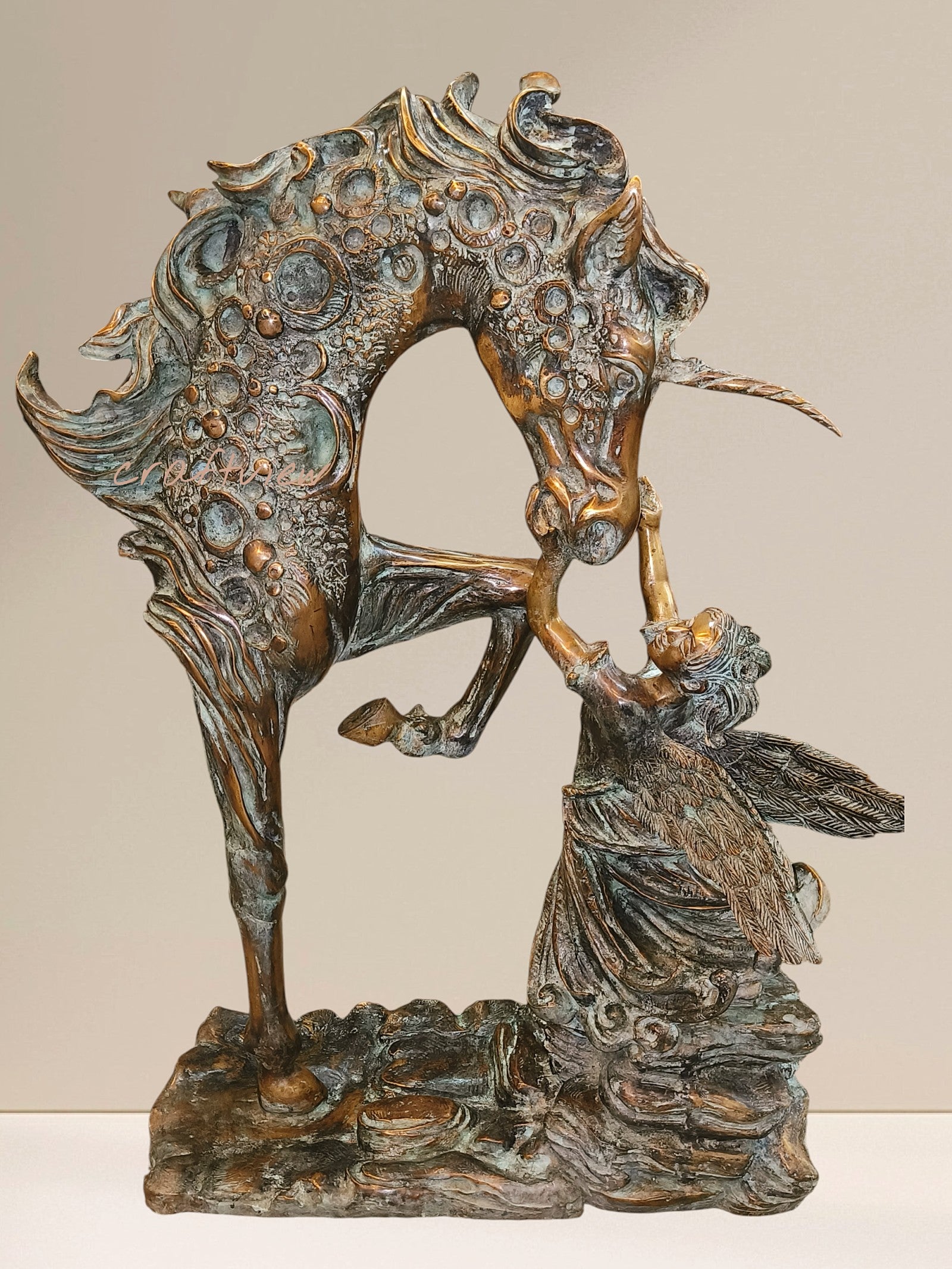 When art meets imagination, it gives birth to creations that transport us into a world of magic and wonder. This Decorative Bronze Sculpture of a Unicorn-Like Horse and a Fairy/Angel Figure is one such masterpiece. A stunning blend of craftsmanship and storytelling, it captures the delicate bond between mythical grace and divine beauty.