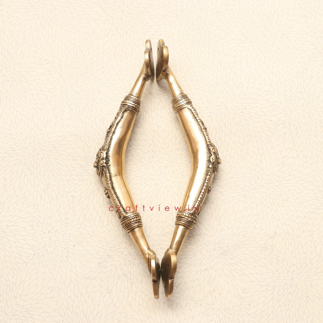 These particular handles are not just functional pieces of hardware; they are intricate works of art. Cast in brass, they possess a beautiful golden hue and a timeless appeal. What truly sets them apart is the detailed craftsmanship. The central portion of the handle features a striking face, reminiscent of ancient deities or tribal masks, encircled by intricate patterns and decorative studs. The flowing, elongated shape and the flared ends with the distinct four-hole clover-like mounting plate give them a regal and powerful presence.